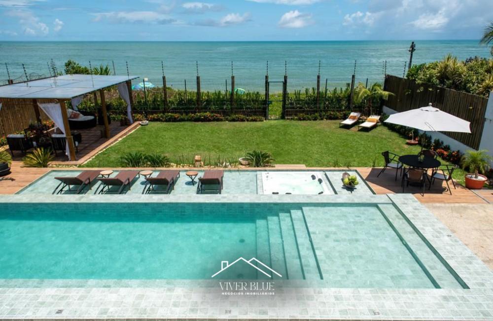 Casa de alto padrão em frente ao mar em Arraial d’Ajuda, com arquitetura moderna, ampla varanda com vista, piscina com borda rasa e espreguiçadeiras, área gourmet integrada e ambiente externo sofisticado.